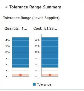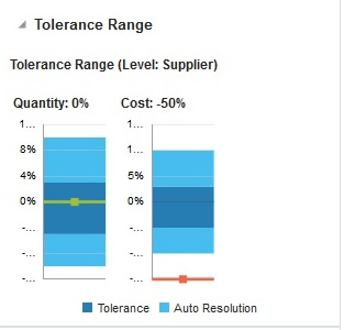If an Auto Resolution threshold has been defined (for line item level tolerance setting), in the Detail Match window, the inner-bounds of that tolerance are displayed in a different color shade with the levels displayed. These levels show the split-out by tolerance and auto resolution tolerance. The Auto Resolution threshold is not shown in the report for the Summary match window, as this does not apply to this level. Move the cursor over the tolerance range bar to view the actual tolerance and auto resolution levels.