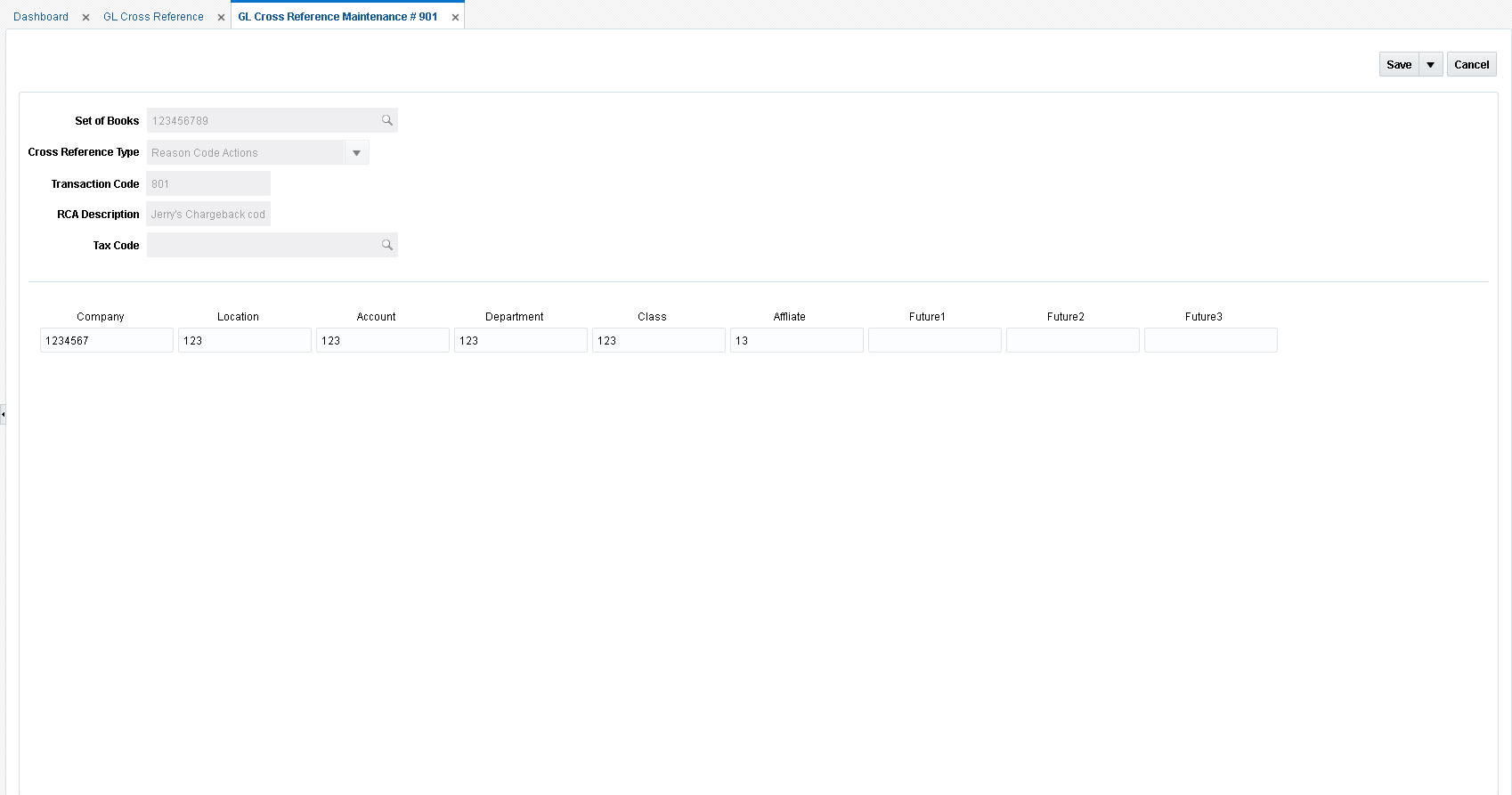 Click Save to save your changes. Alternatively, from the drop down menu, select Save and Close to save your changes and close the window or Save and Add Another to save your changes and add an additional GL cross reference.