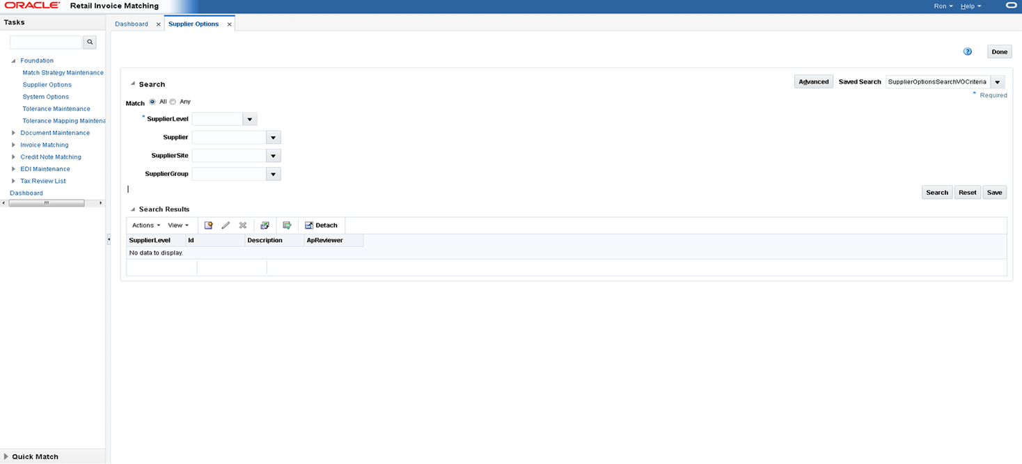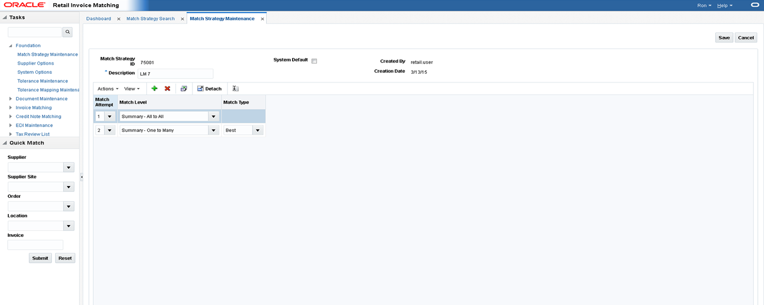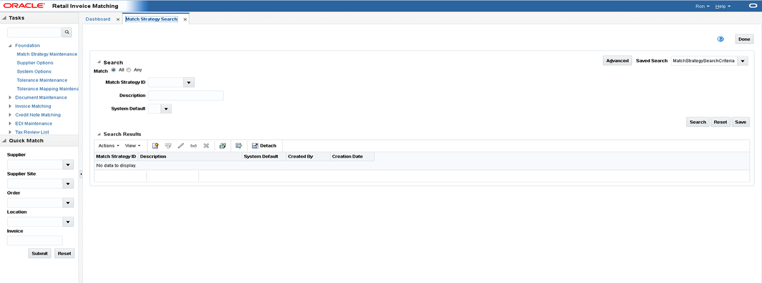 Updated settings are available for all users who log on after the changes are made. To see the changes reflected in Oracle Retail Invoice Matching, you must log out and log in again.