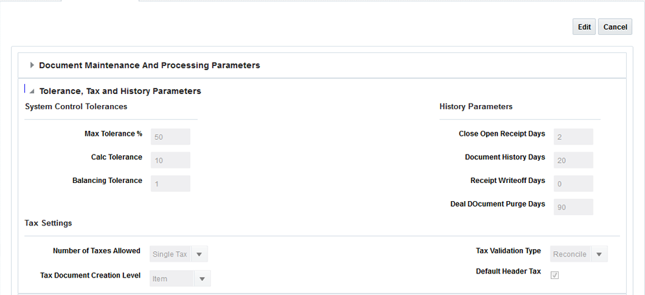 Table 7-2 Tolerance, Tax and History Parameters System Options