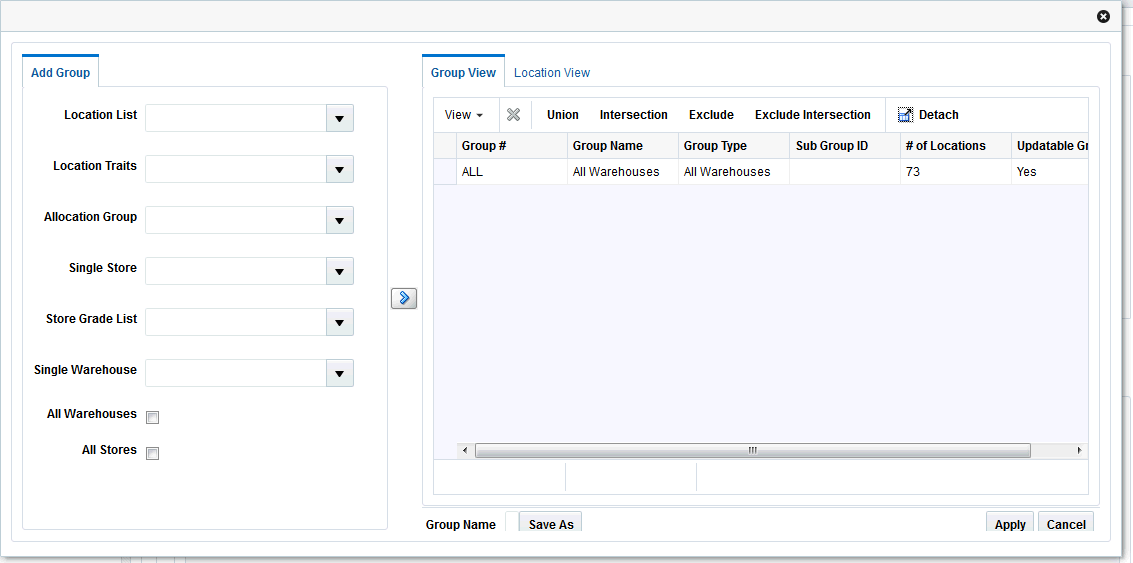The Add Locations window allows you to search and select stores and warehouses for the allocation. You can add locations or groups of locations to an allocation. Various types of groups such as Store Grades, RMS Location Lists & Traits and Allocation Groups can be used as a mechanism to select multiple locations.You can create the following complex groups: