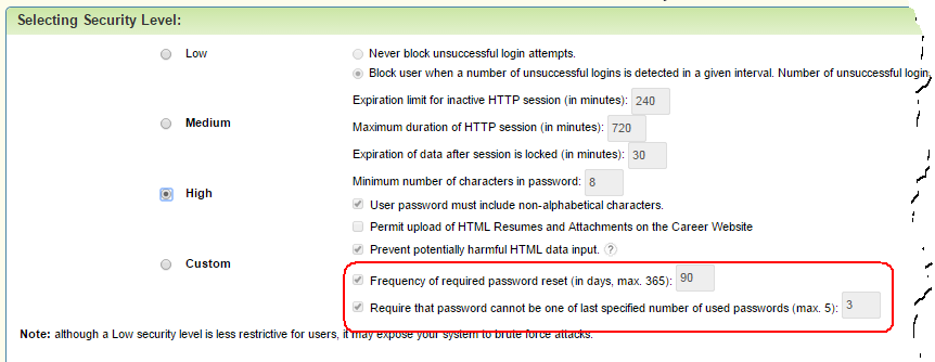 セキュリティ・レベル セキュリティ・レベル設定を構成する手順: 1 「管理」ページの「組織設定」、次いで「セキュリティ・レベル」を選択してください。 2 必要なTaleo Business Editionセキュリティ・レベルを選択します。選択肢として4レベル(「低」、「中」、「高」、「カスタム」)があり、ユーザー・パスワード、失敗したログイン試行、データ・ロック、および長期にわたって使用していない場合のセッション失効、ログインできる最大時間に基づいて選択できます。 「低」、「中」、「高」についてはデフォルトのセキュリティ設定があり、変更できません。セキュリティ設定を変更する場合は「カスタム」を選択してください。 セキュリティ・レベルを変更しても、その影響があるのは、Taleo Business Editionに新規に追加したユーザーとパスワードのみです。すべてのユーザーに対して新しいセキュリティ・レベルを適用する場合は、各ユーザー・レコードの「パスワードの送信」オプションをクリックしてください。セキュリティ設定は、キャリアWebサイトや従業員Webサイトのログインやパスワードには適用されません。 注意: キャリアWebサイトにおける候補者のパスワードは、6文字以上の英数字およびアンダースコアのみで構成される文字列にする必要があります。このルールは構成できません。 「カスタム」セキュリティ設定の場合、「キャリアWebサイト上でHTML形式の履歴書と添付のアップロードを許可」を選択できます。セキュリティの目的で、デフォルトでは選択解除されています。これを選択するのは、HTML形式の履歴書や添付を受け取る必要がある場合のみにしてください。 「有害な可能性があるHTMLデータは入力できません。」を選択解除できるのは、「カスタム」セキュリティ設定の場合に限ります。システムは、求人摘要などのフィールドに入力されたデータを保存する際には常に、有害な可能性があるHTMLデータでないか確認します。この設定を選択すると、入力されたデータは有害である可能性がある旨の警告が現れるので、ユーザーは手動で問題を修正するか、推奨されるクリーン版のHTMLを受け入れることができます。この設定の選択を解除しても、システムは有害なHTMLでないか確認し、同様の警告を表示しますが、HTMLのコンテンツをそのまま保存する旨の選択肢が現れます。 ユーザーがパスワードをリセットする必要がある頻度や、旧パスワードの再利用に関して、2つの設定項目があります。 「パスワードのリセット要求頻度(日数、最大値365)」および「パスワードを、指定した直近の回数で使用した1つにできないことを必須にします(最大値5)」の2つで、「低」、「中」、「高」のセキュリティ・レベルにそれぞれデフォルト値があります。この設定値を変更するためには、「カスタム」セキュリティ設定にする必要があります。 3 「セキュリティ・マネージャ割当」セクションの「追加」をクリックして、セキュリティ・マネージャを割り当てます。 このセクションでは、システム内の機密データに関連するセキュリティ設定を、どの管理者が変更できるか特定します。セキュリティ・マネージャは、ユーザー・ロールまたは個々のユーザーに、機密アクセスに対するアクセス権を付与できます。このセキュリティ・マネージャの設定は、フィールド・レベルの暗号化機能、つまり、社会保障/保険番号、生年月日などの暗号化フィールドを管理者が使用できるようにし、給与などその他の機密情報を入力するカスタムの暗号化フィールドを作成する機能と、組み合せて使用することもできます。詳細は、カスタム暗号化フィールドの作成および暗号化フィールドに対するロール・ベースのアクセス制御の設定を参照してください。 4 「アクセス制御」セクションでは、セキュリティ・レイヤを追加して、管理者が許可した以外のIPアドレスをすべてブロックできます。この機能を有効にすると、Taleo Business Editionシステムにアクセス可能なIPアドレスを制限できるようになります。リモート・ユーザーが、セキュアとみなされていないIPアドレスからログインしようとすると、「非アクセス通知」が現れます。通知は画面上に現れ、ログインIPのブロックで説明するように、カスタマイズ可能です。