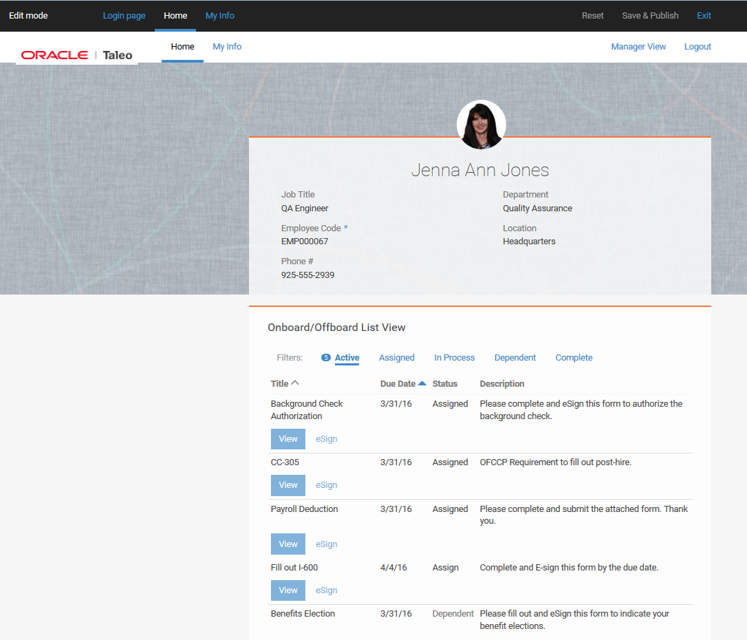 2 ウィジェットをクリックするとそのコンテンツを編集できます。異なるウィジェットは異なる方法で編集されます。ウィジェットを編集する場合、「リセット」ボタンをクリックすると変更を削除でき、削除できるウィジェットの場合は「削除」ボタンをクリックでき、「完了」ボタンをクリックすると、その特定のウィジェットに対する変更を保存できます。また、ウィジェットの外側をクリックする方法で、そのコンテンツを保存することもできます。「完了」または「リセット」をクリックした後、ページ内でウィジェットをドラッグして、赤い領域が表示された時点で放すと、ウィジェットを移動することもできでます。次の例では、リスト・ビュー・ウィジェットが、右側のデフォルトの位置から左側のより狭い列までドラッグされています。ウィジェットは完全にレスポンシブ対応されているため、狭い列にあわせて自動的に調整されます。ページの編集終了後、ページ上部にある「保存して公開」ボタンをクリックします。変更は従業員に即時反映されます。