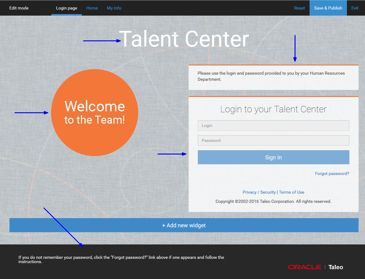 ウィジェットをクリックしてそのコンテンツを編集します。ウィジェットを保存するには、「完了」ボタンをクリックするか、またはウィジェットの外側をクリックします。そのウィジェットの変更を元に戻すには、ウィジェット上部にある「リセット」ボタンをクリックします。ページ下部にある「+ 新規ウィジェットの追加」ボタンをクリックすると、静的HTMLウィジェットを追加できます。新規に追加したウィジェットは、ページの別の場所に移動できます。「ログイン・ページ」の構成終了後、ページ上部にある「保存して公開」をクリックします。