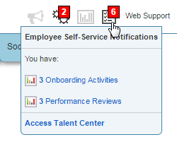 デフォルト・タレント・センターの設定 前述のように、1つのタレント・センターに複数言語でカスタム・コンテンツを追加できるため、各言語に対してタレント・センターを1つずつ作成する必要はありません。ただし、他の理由で複数のタレント・センターを使用する必要がある場合があります。正しいURLを認識しているかぎり、すべての従業員がすべてのタレント・センターにアクセスできます。Taleo Business Editionユーザーがクイック・アクセス・メニュー(ページ上部の小さいメモ帳アイコン)を介してアクセスする、デフォルトのタレント・センターを設定できます。 デフォルト・タレント・センターは、マージ・フィールドの参照先でもあります。 「オンボード/オフボードのカスタマイズ」ページで、次に示すように、クイック・アクセス用に使用する従業員Webサイトとタレント・センターを指定できます。 デフォルトでは、選択した従業員Webサイトがクイック・アクセス用に使用されます。すべての従業員をタレント・センターに移動する準備が整っている場合は、クイック・アクセス・リンクに影響を与える設定を変更できます。 「クイック・アクセス」リンクに対してタレント・センターを使用可能にする手順: 1 「管理」、次いで「組織」を選択します。 2 「システムおよびEメールの設定」をクリックします。 3 「ユーザー・インタフェース設定」まで下にスクロールして、「タレント・センターを従業員のデフォルトのWebサイトにする」を選択します。 4 「保存」をクリックします。 これで、ユーザーがTaleo Business Edition内からタレント・センターにアクセスする際に、クイック・アクセス・メニューを使用すると、従業員Webサイトではなくタレント・センターに移動します。