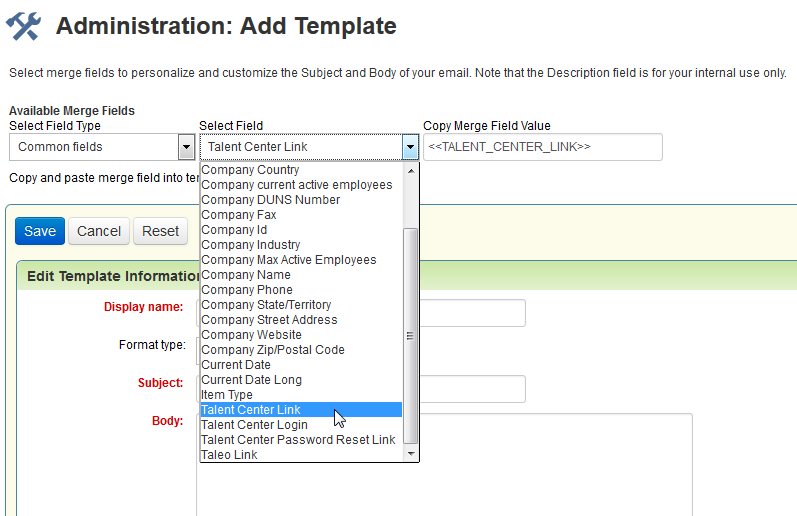 タレント・センター・マージ・フィールド 前述のように、タレント・センターで使用できる新しいマージ・フィールドがあります。これらは、「共通フィールド」領域の下にあり、システムEメール・テンプレートの編集時に使用できます。 3つのマージ・フィールドは次のとおりです。 ・ <<TALENT_CENTER_LINK>> ・ <<TALENT_CENTER_LOGIN>> ・ <<TALENT_CENTER_PASSWORD_RESET_LINK>> 従業員がタレント・センターを使用するための準備が整っている場合は、新規従業員を歓迎するEメールの中のマージ・フィールドを最初の2つのマージ・フィールドに更新し、パスワード回復Eメールの中のマージ・フィールドを3番目のマージ・フィールドに更新します。複数のタレント・センターを構成している場合、これらのマージ・フィールドは、「オンボード/オフボードのカスタマイズ」ページで設定されたデフォルトのタレント・センターを参照します。