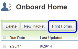 オンボード・ホーム・リスト・ビュー、およびこのリスト・ビューのすべての作成済バージョンに、「フォームの印刷」ボタンがあります。このボタンへのアクセスは、「従業員」リスト・ビューからEメール送信フォームに対するのと同じアクセス制御によって制御されます。このボタンは、デフォルトで管理者ロールがあるユーザーにのみ表示されますが、「従業員」リスト・ビューで「フォーム」ボタンを使用可能にするのと同じ手順に従って他のユーザーに対しても使用可能にできます。詳細は、構成可能なフォームにアクセス権を割当てを参照してください。