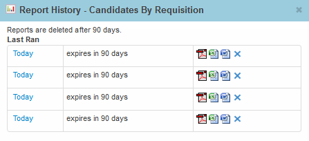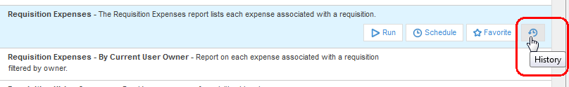 レポート履歴の表示 レポート履歴を表示するには: 1 「レポートの実行」ページで、アクション・ボタンが表示されるまで、レポート・タイトルの上にカーソルを置きます。 2 「履歴」をクリックします。 3 モーダル・ウィンドウが開きます。選択したレポートの以前実行したインスタンスが、最新のレポートを先頭にして表示されます。(履歴は90日間保持され、アクセスが可能です。) 4 レポート・リンクをクリックしてレポート・インスタンスを表示します。 5 レポートの期限が近くなると、失効情報がまずオレンジ色、その後は赤色で表示されます。レポートを保持する場合は、失効前にハードドライブにダウンロードしてください。 6 レポートをダウンロードするには、使用可能な形式アイコン(PDF、ExcelまたはWord)のいずれかをクリックし、レポートをハードドライブに保存します。 7 または、Xアイコンをクリックしてレポート・インスタンスを削除できます。(レポート履歴が削除されると、関連するレポート通知も削除されます。)