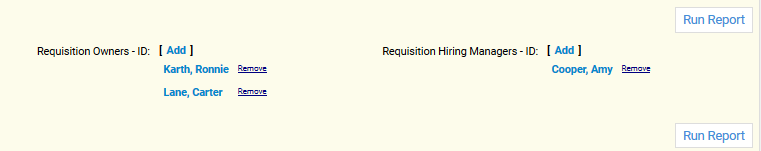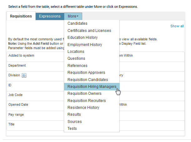 総計フィールドの使用 カスタム・レポートを作成する際に総計フィールドを使用して、冗長性を最小限に抑え、見やすいレポートを作成することができます。 総計フィールドを使用しないと、もしも1つの求人について3人の求人所有者が関連付けられている場合、同じデータ行が3回繰り返されることになります。どの行にも同じ求人データが表示され、唯一の異なる点が求人所有者のみとなります。複数のフィールドおよび表結合とともに異なる点が増加していくと、データ行の数は急激に飛躍します。データ出力自体は有効ですが、行の繰り返しにより、レポートの有用性が影響を受ける恐れがあります。 総計フィールドが使用できるレポートは次のとおりです: 求人表 • 求人所有者総計 • 求人承認者総計 • オファー承認者総計 • 人材紹介会社総計 • ディビジョン • 候補者数 - [ReqCan Status Name] (たとえば、「候補者数 - 採用済」) これらのフィールドは、ワークフロー・ステータスに移行した候補者合計を総計しています。たとえば、「候補者数 - インタビュー」は、現在、指定された求人のインタビュー求人固有ステータスにある候補者数ではなく、これまでにこのステータスに進んだ候補者の合計数を表示します。これは履歴における数です。 • 候補者の平均日数[ReqCan Status Name]--候補者がワークフロー・ステータスにある平均日数が総計されます。 • 適用される候補者数--求人に関連付けられた候補者数が計算されます。 • 求人の実日数[ReqCan Status Name]--求人が特定のステータスにある実日数が総計されます。 注意: 「実日数-オープン」は保留時間を除外します。 求人承認者表 • 承認時間 - 求人--承認者間の時間が総計されます。 候補者表 • インタビュー担当者総計 • インタビュー担当者によるフィードバック総計 求人候補者表 • 実日数[ReqCan Status Name] (たとえば、「実日数 - インタビュー」)--候補者が求人固有ワークフロー・ステータスにある実日数が総計されます(たとえば、「実日数 - 電話画面」)。 注意: 候補者が特定のステータスにいた時間が24時間未満のとき、レポートには0と表示されます。 オファー承認者表 • 承認時間 - オファー--承認者間の時間が総計されます。 報酬サイクル表 • サイクル所有者総計 • サイクル承認者総計 業績レビュー表 • 業績レビュー承認者総計 • 数値計算されたマネージャ評点 計算されたマネージャ・スコア*最大評点スコア=数値計算されたマネージャ評点(例: 80*5 = 4.00)。10ポイント・スケールの場合xx.xxと表示します。 • 数値計算された従業員評点 計算された従業員スコア*最大評点スコア=数値計算された従業員評点(例: 80*5 = 4.00)。10ポイント・スケールの場合xx.xxと表示します。 注意: 総計フィールドは、ユーザー表結合のかわりに使用することも、同時に使用することもできます。たとえば、「求人所有者総計」フィールドを使用して、レポート内の1つの表示フィールドにすべての求人所有者を表示し、求人所有者表を除外することができます。表結合が総計フィールドの追加として、またはそのかわりに使用される場合、繰り返し行は表示されます。 総計フィールドをパラメータとして使用することはできません。「求人採用マネージャ」および「求人採用担当者」フィールドは総計フィールドとして表示されませんが、これらのフィールドは総計フィールドと同様に機能するため、パラメータとして追加できません。ただし、これらのユーザーの名前に加えて、求人所有者、オファー承認者など、他の実在の関係者の総計フィールドをこれらの関係者のIDを使用してパラメータとして追加する方法があります。 求人の関係者フィールドをパラメータとしてカスタム・レポートで使用する手順 1 関心のある関係者の表を含むカスタム・レポート・トピックを特定します(例: 「求人別候補者」トピック)。 2 レポートの作成時に、「その他」メニューで関係者の表を探します。たとえば、求人採用マネージャをパラメータとして追加する場合は、「その他」メニューから「求人採用マネージャ」表を選択します。 3 IDフィールドをレポートのパラメータとして追加します。 4 他の関係者フィールドの追加を続行し、レポートを完成します。 5 レポートの実行時に、いずれかのパラメータの「追加」をクリックします。 6 ユーザーのリストがシステムに表示され、1つ以上の名前を選択できます。 ユーザー・レコードに、対応する関係者アクセス権を現在持っているユーザーのみではなく、ユーザーの完全なリストが表示されます。これによって、たとえば、指定したユーザーが求人採用マネージャであった求人を、現在はこのユーザーにこのアクセス権が付与されていない場合でも検索できます。 次の例のレポート結果には、Ronnie KarthまたはCarter Laneが求人所有者で、かつAmy Cooperが求人採用マネージャであるすべてのレコードが表示されます。