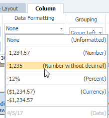 データ表のフッター行 カスタム・レポートにデータ表を挿入すると、デフォルトで表にはフッター行が含まれます。さらに、数値フィールドが含まれる列には、フッター行に列のデータを合計する式が含まれます。ユーザーIDなどの場合は値を合計する必要がないため、フィールドからこの合計を削除することができます。また、かわりに平均計算式に変更することもできます。 フッター行の合計式を削除するには: 1 変更する列で、列の全データの合計が含まれている下の青いフッター行をクリックします。 2 レポート・デザイナに表示される合計セルタブで、「式」ドロップ・ダウンから空白のテキストを選択します。 フッター行の式を平均に変更するには: 1 変更する列で、下の青いフッター行をクリックします。 2 合計セルタブで、「式」ドロップ・ダウンから「平均」を選択します。 3 この平均の小数点以下の桁数を変更するには、データの書式設定ドロップ・ダウンから「数値」を選択します。 4 書式を数値に変更すると、新しいアイコンがすぐに表示され、桁数を追加または削除できるようになります。小数点以下の桁数を増やすには、左向きの矢印をクリックします。 表からフッター行を削除するには: 1 データ表をクリックして、特定の列ではなく、表全体をハイライト表示します。このために、いったんデータ表の外側をクリックし、再度表をクリックする必要がある場合があります。 2 レポート・デザイナ上部の「表」タブで、「表示」ドロップ・ダウンをクリックします。 3 下に青い行が表示されていない図を選択します。 4 表のフッター行が削除されます。