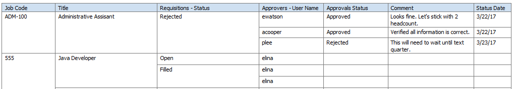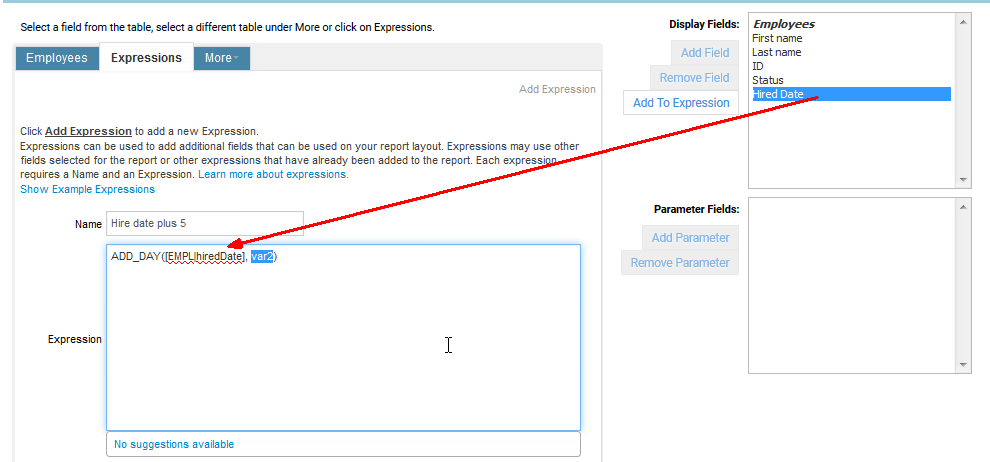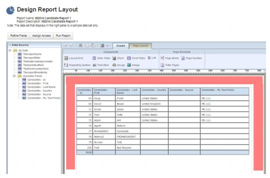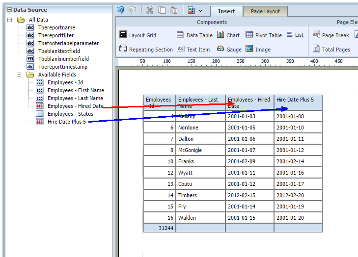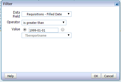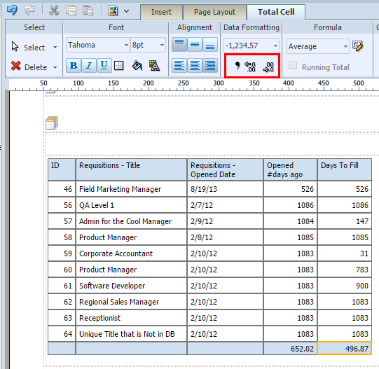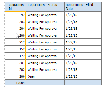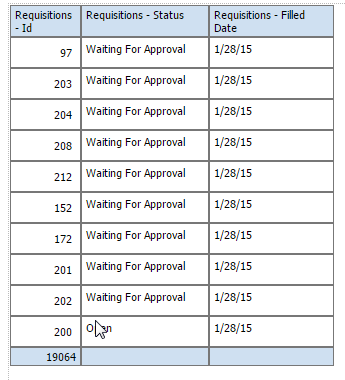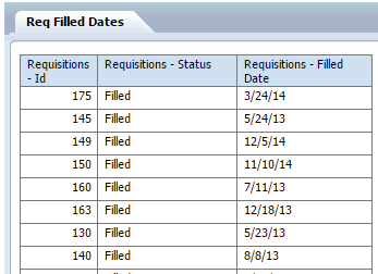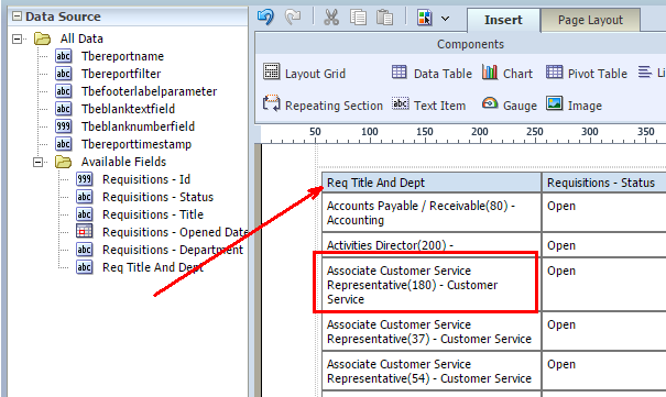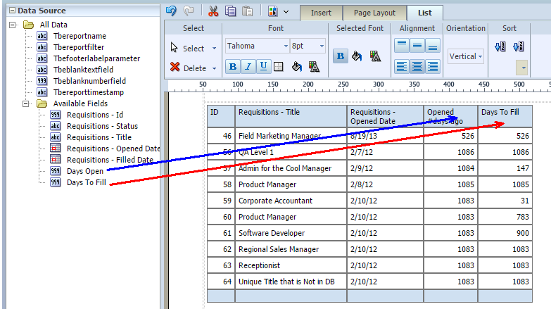 8 「次」をクリックしてレポート・デザイナに進みます。フィールドおよび式は両方ともレポート・レイアウトに含められるようにデータ・ソース・パネルに表示されます。'オープン日数' - DIFF_DAY([REQU|openedDate], TODAY())'補充までの日数' - DIFF_DAY([REQU|openedDate], [REQU|filledDate])フィールドの値がNULL/空白のときにレポートに特定の値を表示する場合、複合式if ISNULLを使用できます。オプション1: NULL値を除外するよう表をフィルタします。