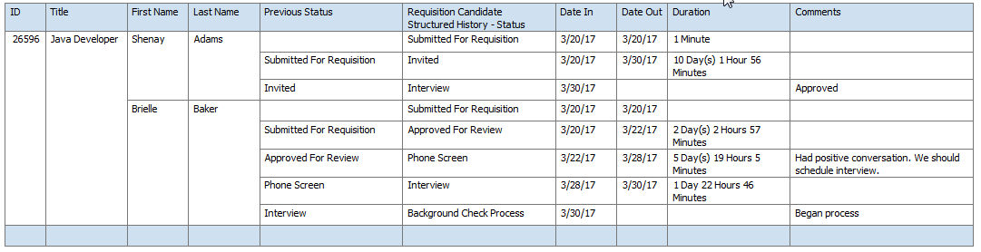「候補者の求人アクティビティ」というカスタム・トピックを使用して、候補者について求人ステータスの変更(求人特定のステータスの変更)ごとにレポートを作成できます。このトピックには、「求人候補者」、「求人」、「候補者」、「求人候補者構造化履歴」および「求人候補者履歴作成者」の各表が含まれています。