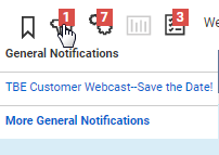 管理者への通知 Taleo Business Editionに新しい通知機能が追加され、管理者とより良好にやり取りできるようになりました。 システムの右上隅に、4つのアイコンがあります。拡声器アイコンは、Taleo Business Editionの製品管理グループが管理者と共有する、一般的なお知らせ(近く実施する顧客向けウェブキャストの案内など)に使用します。第2のアイコンはその他の自動イベント通知用です。3つめはレポート通知用です。4つめのアイコンは、従業員レコードがあるユーザーに対してのみ現れます。 第1のアイコン上に赤い番号がある場合、このアイコンをクリックしてメッセージを読んでください。 読み終わると赤い番号がひとつ減ります。メッセージ自体は、未読メッセージのリストから削除されます。読み終えたけれどもまだ削除していないメッセージや、永続メッセージは、下にある「その他の一般通知」リンクからアクセスできます。