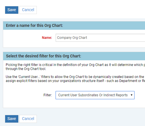 組織チャートの構成 組織チャートはデフォルトで使用可能であり、組織チャートを表示しているユーザーに基づいて、どの組織チャートが表示されるかを制御するフィルタおよびバージョンを作成できます。 組織チャートを構成する手順: 1 「管理」メニュー、「Performのカスタマイズ」または「オンボードのカスタマイズ」の順に選択します。 2 「ページのカスタマイズ」セクションで、「組織チャート」をクリックします。 3 組織チャートを選択し、「アクション」メニューから「編集」をクリックします。次のページが表示されます。 4 デフォルトの「名前」をそのまま使用するか、適宜変更します。 5 ページの指示を注意して読みます。 正しいフィルタを選択することは、組織チャート・ツールを使用して組織のどのポジションを表示可能にするかを決定するため、組織チャートの定義において重要です。 「現在のユーザー...」のいずれかのフィルタを使用すると、組織チャートを表示しているエンド・ユーザーに基づいて、組織チャートを動的に作成できます。また、部門または地域など、組織の構造自体に基づいてフィルタを明示的に割り当てることもできます。 6 フィルタを選択します。 7 「保存」をクリックします。