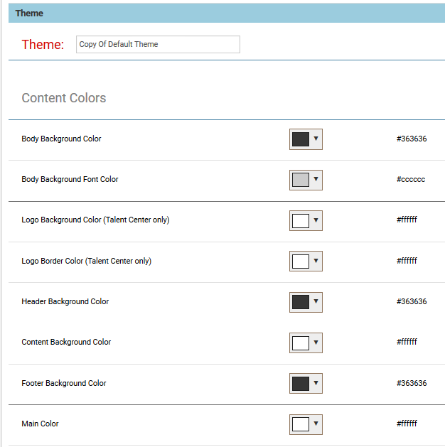 カスタム・テーマの使用 タレント・センターに使用できる標準のテーマがあります。これらの標準テーマを複製してカスタマイズし、企業カラーにあわせてタレント・センターの色やフォントを選択できます。色の選択は、使いやすいカラー・ピッカーを使用する他、16進コードで指定することも可能です。 注意: モダンという標準テーマが、タレント・センター専用に最適化されました。 テーマを複製してカスタマイズする手順: 1 「管理」を選択し、有効にしたサービスに該当する「カスタマイズ」ページを選択します。 2 「ページのカスタマイズ」セクションに、「テーマのカスタマイズ」というエントリがあります。「テーマ」リンクをクリックしてください。 3 いずれかの標準テーマを選択し、右側の「アクション」メニューから「複製」を選択します。 注意: 複製したバージョンをさらに複製することも可能です。 4 テーマの名前が「…のコピー」となっているため、適宜変更してください。名前は一意である必要があります。 5 カスタマイズ可能な色の様々なカテゴリが、コンテンツの色、ボタンの色、フォントの色に分けて表示されています。リストされているカテゴリは、キャリア・センターの各コンポーネントに対応します。たとえば、コンテンツの色のカテゴリの一部は次のようになります。 6 あるカテゴリの色をクリックすると、カラー・ピッカーが現れます。 7 適切な色ボックスを選択するか、ボックスにコードを入力してください。大きな正方形の領域をクリックすると、現在の色をわずかに変えることもできます。 8 望ましい色になったら「選択」をクリックしてください。 9 他の色についても同様に更新します。 10 下部までスクロールすると、フォント・ファミリを選択できます。フォントの外観(太字、その他)はTaleo Business Editionによって制御されます。 注意: 選択したフォント・ファミリがブラウザに組み込まれていない場合は、当該ブラウザのデフォルト・フォントが使用されます。 11 テーマの更新が終わったら「保存」をクリックします。 設定済のカスタム・テーマは、どのタレント・センターにでも適用できます。 テーマを適用する手順: 1 「管理」を選択し、有効にしたサービスに該当する「カスタマイズ」ページを選択します。 2 「キャリア・センターの管理」セクションで、カスタマイズするタレント・センターに対する「管理」をクリックします。 3 「テーマ」ドロップダウン・メニューから、必要なテーマを選択します。 4 「保存」をクリックします。 テーマはいつでもカスタマイズでき、このテーマを使用しているタレント・センターが更新されます。