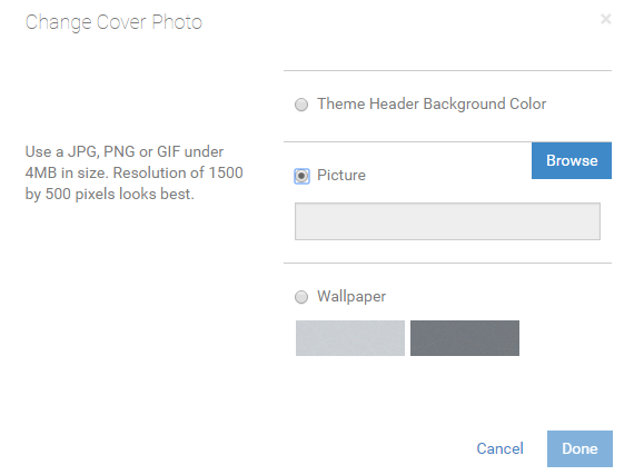 壁紙のカスタマイズ タレント・センターのログイン・ページ、「ホーム」ページおよび「自分の情報」ページの壁紙はカスタマイズできます。適用済のテーマから背景色を選択するか、または独自のイメージを背景として追加できます。この機能を使用すると、顧客は企業イメージにあわせてタレント・センターをブランディングできます。 壁紙のイメージをカスタマイズする手順: 1 「管理」を選択し、有効にしたサービスに該当する「カスタマイズ」ページを選択します。 2 「タレント・センターの管理」セクションで、該当するタレント・センターの「ページの編集」をクリックします。 3 「ホーム」ページで、ページ上部にある「カバー写真の変更」をクリックします。 4 使用可能ないずれかのオプションを選択します。デフォルトの壁紙がデフォルトで選択されていますが、テーマの背景色を使用するように選択するか、またはロケール・ドライブからイメージを選択できます。写真を選択した場合は、イメージの選択可能な形式と推奨サイズの説明が表示されます。 5 「参照」ボタンを使用してイメージを探して、「完了」をクリックします。 6 「自分の情報」タブおよび「ログイン・ページ」タブをクリックし、処理を繰り返してこれらの他のページをカスタマイズします。推奨ファイル・サイズは、ページによって異なることに注意してください。 7 壁紙のカスタマイズ終了後、右上隅にある「保存して公開」をクリックします。 これで、タレント・センターの様々なページで、従業員に別の背景イメージが表示されるようになります。 注意: 10MBまでのイメージを追加できますが、ファイル・サイズが大きいと、モバイル・デバイスで応答時間が遅くなる場合があります。イメージの追加時にこのことに留意して、すべての従業員のパフォーマンスが向上するように小さいイメージを選択してください。