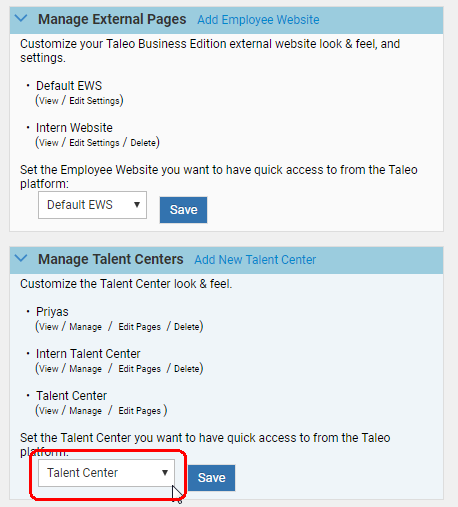 デフォルトのタレント・センターの設定とクイック起動の構成 1つのタレント・センターに複数言語でカスタム・コンテンツを追加できるため、各言語に対してタレント・センターを1つずつ作成する必要はありません。ただし、他の理由で複数のタレント・センターを使用する必要がある場合があります。 正しいURLを認識しているかぎり、すべての従業員がすべてのタレント・センターにアクセスできます。Taleo Business Editionユーザーがクイック・アクセス・メニュー(ページ上部の小さいメモ帳アイコン)を介してアクセスする、デフォルトのタレント・センターを設定できます。 デフォルト・タレント・センターは、マージ・フィールドの参照先でもあります。 該当する「カスタマイズ」ページを使用して、次に示すように、クイック・アクセス用に使用する従業員Webサイトとタレント・センターを指定できます。 デフォルトでは、選択した従業員Webサイトがクイック・アクセス用に使用されます。すべての従業員をタレント・センターに移動する準備が整っている場合は、クイック・アクセス・リンクに影響を与える設定を変更できます。 「クイック・アクセス」リンクに対してタレント・センターを使用可能にする手順: 1 「管理」、次いで「組織」を選択します。 2 「システムおよびEメールの設定」をクリックします。 3 「ユーザー・インタフェース設定」まで下にスクロールして、「タレント・センターを従業員のデフォルトのWebサイトにする」を選択します。 4 「保存」をクリックします。 これで、ユーザーがTaleo Business Edition内からタレント・センターにアクセスする際に、クイック・アクセス・メニューを使用すると、従業員Webサイトではなくタレント・センターに移動します。