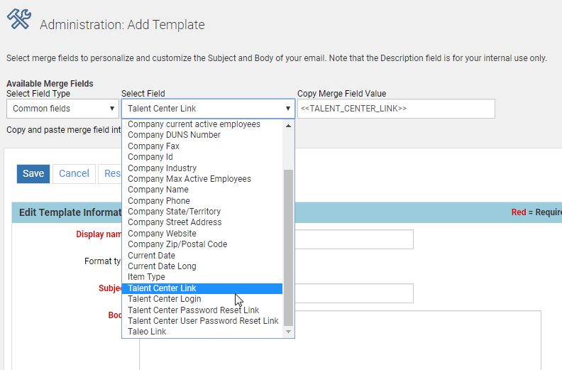 タレント・センター・マージ・フィールド タレント・センター向けのマージ・フィールドが用意されています。これらは、「共通フィールド」領域の下にあり、システムEメール・テンプレートの編集時に使用できます。 3つのマージ・フィールドは次のとおりです。 ・ <<TALENT_CENTER_LINK>> ・ <<TALENT_CENTER_LOGIN>> ・ <<TALENT_CENTER_PASSWORD_RESET_LINK>> 従業員がタレント・センターを使用するための準備が整っている場合は、新規従業員を歓迎するEメールの中のマージ・フィールドを最初の2つのマージ・フィールドに更新し、パスワード回復Eメールの中のマージ・フィールドを3番目のマージ・フィールドに更新します。 複数のタレント・センターを構成している場合、これらのマージ・フィールドは、「オンボード/オフボードのカスタマイズ」ページで設定されたデフォルトのタレント・センターを参照します。