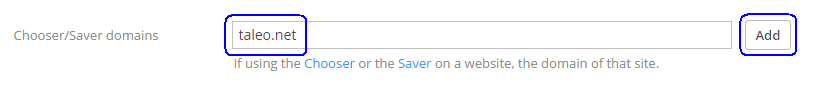 8 新たに作成したアプリケーションの「Settings」画面に切り替わります。画面の下部にある「Chooser/Saver」ドメイン・フィールドに「taleo.net」と入力し、「Add」ボタンをクリックします。