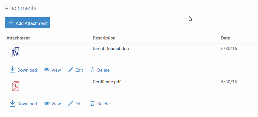 「添付」ウィジェット 管理者が「自分の情報」ページに「添付」ウィジェットを追加すると、このウィジェットを使用してドキュメントをアップロードできます。このウィジェットは、従業員レコードで使用できるようになります。 たとえば、「添付」ウィジェットを介して文書をアップロードするように依頼するタスクが割り当てられる場合があります。その他に、運転免許証のイメージをスキャンしてアップロードし、タスクを完了としてマークできます。 添付できるファイル・タイプは次のとおりです。.gif、.rtf、.doc、.pdf、.zip、.docx、.csv、.txt、.gz、.xlsx、.xls、.ppt、.pptx、.png、.jpg 「添付」ウィジェットの使用 1 タレント・センターにログインしたら、ページ最上部にある「自分の情報」リンクをクリックします。 2 「添付の追加」ボタンをクリックし、該当する添付を見つけます。 3 ファイルの名前も摘要として使用されます。新しい摘要を入力するには、鉛筆アイコンをクリックします。 4 「保存」をクリックします。 添付ファイルは削除でき、削除すると添付ファイルは従業員レコードから削除されます。添付ファイルは表示してダウンロードすることもできます。「編集」ボタンを使用すると、摘要を変更するか、別の添付ファイルをアップロードして元の添付ファイルを置き換えられます。