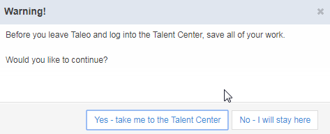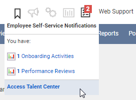 従業員セルフサービス通知およびクイック起動 Taleo PerformおよびOnboardユーザーは、Taleoプラットフォーム内からタレント・センターまたはレガシーEWSに資格証明を再入力せずに移動できます。最初にEWSまたはタレント・センターにログインした後でTaleo PerformまたはOnboardにアクセスすることもできます。これらの両方のオプションは管理者が構成します。 Taleo Business Editionシステム上部の通知バーにあるのは、従業員セルフサービス通知アイコンです。 これは、アクティブな従業員レコードがあるユーザーに表示されます。アイコンには、従業員ポータルで注意が必要なタスクの通知が示され、アイコンをクリックすると、次のタイプの未処理タスクが表示されます。 ・ オンボーディング・アクティビティ ・ 複数の評点担当者の要求 ・ 自己評定のレビュー 各グループはクリック可能なハイパーリンクで、資格証明の入力なしで従業員Webサイトまたはタレント・センターが起動します。未処理タスクがないユーザーも、リンクをクリックすることでEWSまたはタレント・センターをクイック起動できます。 クイック起動するリンクをクリックすると、次の警告が表示され、Taleo Business Editionの外部に移動することが明確に示されます。 従業員Webサイトまたはタレント・センターでタスクを完了した後に、Taleo Business Editionに戻るには、右上隅にあるリンクを使用できます(レガシーEWSの場合は「マネージャ・ビューに切替え」、タレント・センターの場合は「マネージャ・ビュー」)。 Taleoユーザーである従業員の場合、最初にEWSまたはタレント・センターにログインすると、管理者が表示するように構成していれば、この同じリンクが表示されます。