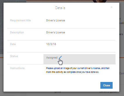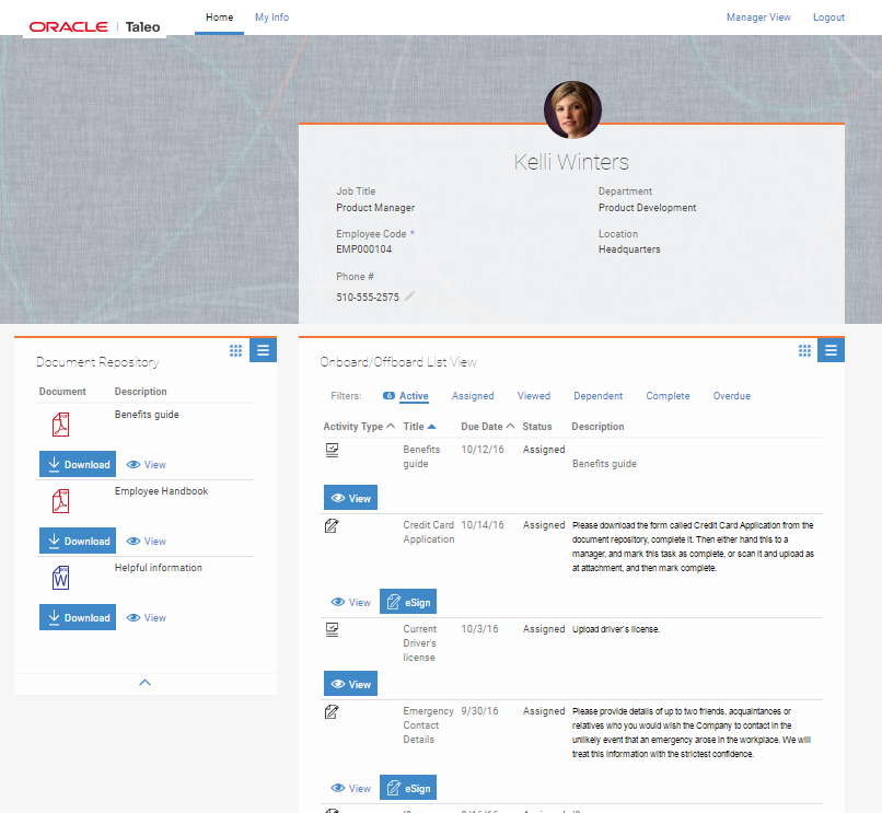 ページ上部に「従業員プロファイル要約」があります。フィールドの横に小さな鉛筆アイコンが表示されていれば、フィールドに変更を加えることができます。データを更新し、チェックマーク・ボタンをクリックして保存します。管理者は、重要な企業発表をホーム・ページに掲載したり、重要な文書を格納した文書リポジトリを設定したりすることもできます。これが構成されている場合は、対応するボタンをクリックすることで、文書を表示およびダウンロードできます。署名が必要なフォームが割り当てられている場合は、「電子署名」ボタンが表示されます。タスクが割り当てられている場合は、「表示」ボタンが表示されます。タスクの詳細を参照するには、「表示」またはハイライトされた行の任意の場所をクリックし、指示に従います。ステータスを更新する準備ができたら、「ステータス」フィールドの隣の鉛筆をクリックします。