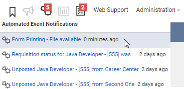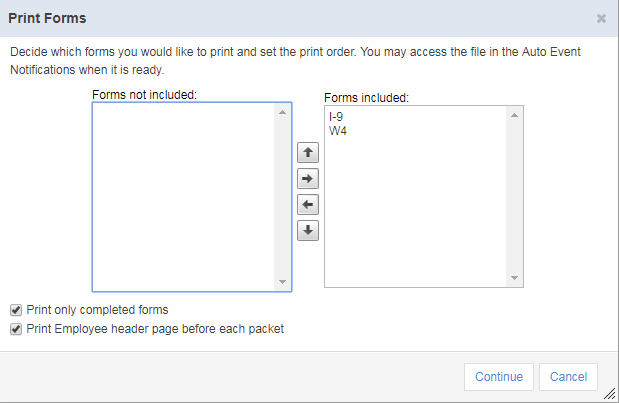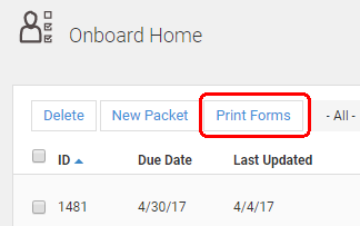 オンボード・ホーム・リスト・ビュー、およびこのリスト・ビューのすべての作成済バージョンに、「フォームの印刷」ボタンがあります。このボタンへのアクセスは、「従業員」リスト・ビューからEメール送信フォームに対するのと同じアクセス制御によって制御されます。このボタンは、デフォルトで管理者ロールがあるユーザーにのみ表示されますが、「従業員」リスト・ビューで「フォーム」ボタンを使用可能にするのと同じ手順に従って他のユーザーに対しても使用可能にできます。詳細は、構成可能なフォームにアクセス権を割当てを参照してください。