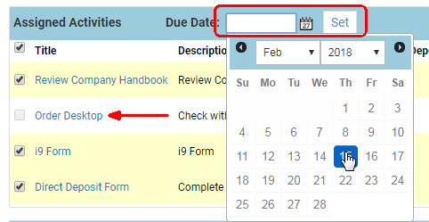複数のアクティビティの期日を一度に設定 オンボーディング/オフボーディング・パケットを割り当てるとき、またはアクティビティを既存のパケットに追加するとき、複数のアクティビティに期日を一度に設定できます。割当時に期日を入力または変更できるアクティビティが対象です。この機能を使用すると、時間を節約でき、多数のアクティビティに期日を入力する際にユーザー・エラーが発生する可能性を低くできます。 アクティビティ・テンプレートを作成するとき、割当時に期日を設定するか、または開始日または採用日に基づいて期日を設定するかを選択できます。後者のオプションを選択した場合は、割当時に変更が可能です。複数の期日を一度に設定する際、定義済の期日を割当時に上書きできないタスクは対象外です。 アクティビティの複数の期日を一度に割り当てる手順: 1 従業員の新規パケットを作成します。 2 1つのバンドル、または複数のアクティビティ(あるいはその両方)を追加します。 3 表の左側に、チェック・ボックスの列があります。個々のチェック・ボックスを選択するか、または最上部のチェック・ボックスを選択して使用可能なすべてのアクティビティを選択します。 注意: 割当時に期日を変更できないアクティビティはグレー表示されます。 4 カレンダ・アイコンから期日を選択し、「設定」ボタンをクリックします。 5 必要に応じて、別のアクティビティのサブセットを選択し、期日を設定します。 6 パケットを保存します。 追加する新規のアクティビティまたはバンドルに対してのみ、パケットの編集時に期日を設定できます。以前に追加したアクティビティは変更できません。