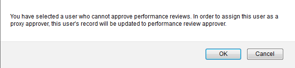 現在承認権限がないユーザーを、管理者が代理承認者として選択すると、警告が現れます。管理者は続行でき、代理承認者のユーザー・レコードは、この処理以降は承認権限が含まれるように変更されます。
