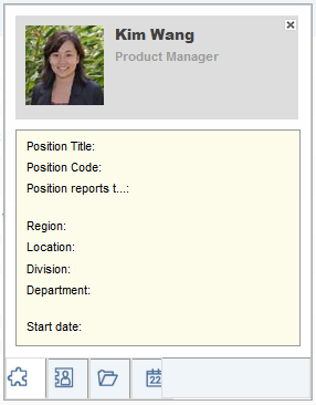タレント・カード 「タレント・カード」は、従業員に関する情報をグラフィカルに表現したもので、見た目の印象を強くし、使用しやすくするのが目的です。 タレント・カードを使用すると、検索やナビゲーションの手間をかけることなく、従業員に関する主な情報を簡単に得ることができます。リンク上をマウス・オーバーするだけで、タレント・カードが開くからです。タレント・カードには、「組織図」を介してアクセスすることも可能です。マウス・クリックするのみで、関係する情報(その内容はビジネスの必要性に応じて細かく設定可能)を表示できます。