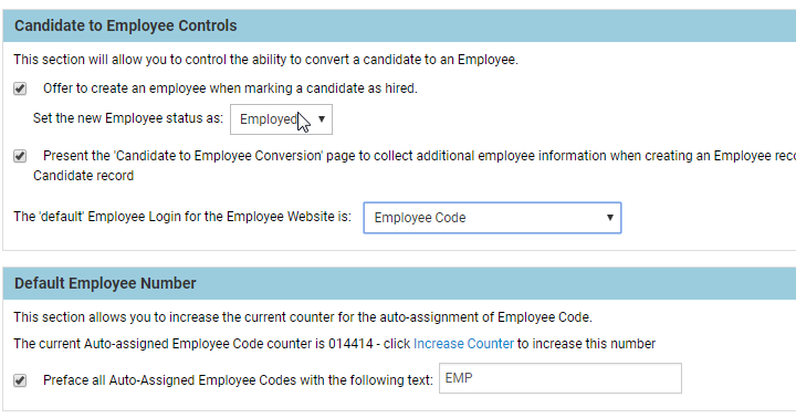 既存の従業員採番システムがあり、現在の採番システムと同期するように自動割当従業員コードのカウンタを増やす場合は、カウンタの増分をクリックします。