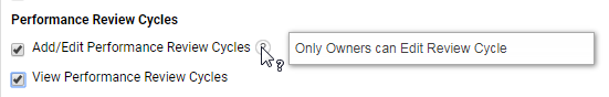 レビュー・サイクルに関係するロール文書には、2つのアクセス制御設定があります。これらの設定は、管理者に対しては自動的に選択されています。他のユーザーがパフォーマンス・レビュー・サイクルを追加、編集および表示できるようにする場合は、これらの設定を他のユーザーのロールに対して選択する必要があります。
