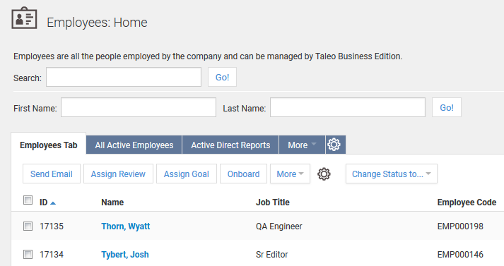 Taleo Business Edition管理者は、任意のリスト・ビュー・ページに複数のビューを割り当てることができます(これらはスマート・ビューと呼ばれます)。これにより、ビューを切り替えて簡単に情報にアクセスできます。例として従業員ビューを使用して、「従業員」タブをクリックすると、従業員要約データのデフォルト・ビューが表示されます(これは割り当てられたロールとデフォルト・リスト・ビュー設定に基づきます)。スマート・ビューでは、現在のアクティビティに応じて、ビューを簡単に変更して、異なる地域、部門またはステータス(直属のすべての部下、すべての部下、レビュー期限が超過したすべての従業員など)の従業員を表示できます。