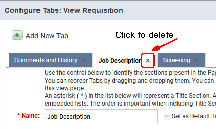 タブ・ページの削除 ユーザーは、ユーザーが作成したタブ・ページは削除できますが、管理者が作成したタブ・ページは削除できません。 タブ・ページを削除する手順: 1 削除するタブ・ページを含むページに移動します。 2 タブ・ページ・アイコンをクリックします。 3 削除するタブの横にあるXをクリックします。 4 確認メッセージが表示されます。削除は元に戻せません。進む場合は「OK」をクリックします。 5 タブ・ページの構成ページで、「クローズ」をクリックします。前のページに戻りますが、タブは表示されません。