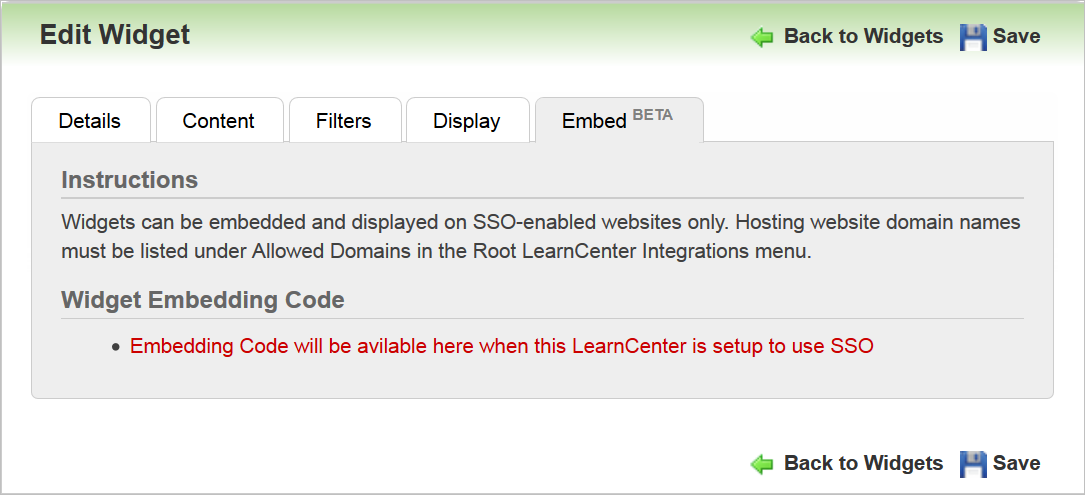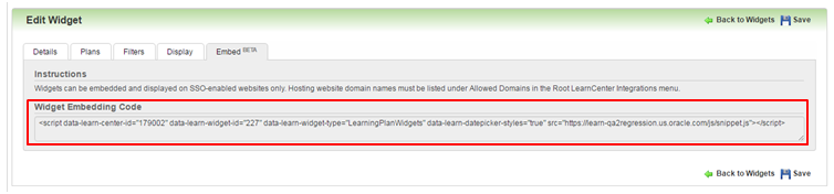 学習ウィジェットの構成 ウィジェットのポータビリティによって、タレント・センターの学習ウィジェットにコード・スニペットを配置することで、SSO対応のタレント・センターにウィジェットを埋め込むことができます。つまり、タレント・センターのページで学習センター・ウィジェットを使用できます。 ルート学習センターの新しい「許可されるドメイン」ページを使用してウィジェットを使用するには、TBE本番ドメインであるhttps://tbe.taleo.netをホワイトリストに登録する必要があります。Webサイトをホワイトリストに登録すると、そのWebサイトの使用が安全であることを学習センターに伝えることになります。外部ページに配置されると、デフォルトの学習センターCSSスタイルを上書きすることによって、そのWebサイトのデザインにあわせてウィジェットの外観をカスタマイズできます。 学習ウィジェットを有効にする手順: 1 学習センターに対してSSOを有効にします。学習センターに対して学習SSOを有効にするには、TBE学習SSO設定ガイドを参照してください。 2 「+ 新規ウィジェットの追加」ボタンを使用して学習ウィジェットをタレント・センターに追加し、ウィジェットに表示されるリンクに従います。 3 適切なドメイン情報を「許可されるドメイン」ページ(ルート「学習センター」→「統合」→「許可されるドメイン」)に入力します。 4 ウィジェットの埋込みBETAタブ(「管理パネル」→「学習センター・デザイン」→「ウィジェット」→ウィジェットの埋込みBETAタブ)からコード・スニペットをコピーします。 SSO用に学習センターをまだ設定していない場合、ここにコードはなく、かわりにメッセージが表示されます。 類似の警告メッセージが表示され、ルート学習センターの「許可されるドメイン」ページで許可されたドメインが保存されていない場合に通知されます(詳細は前述の説明を参照)。 5 タレント・センターの適切な学習ウィジェットにコードを貼り付け、「完了」またはウィジェットの外の領域をクリックします。 6 (オプション)ウィジェットがホスティング・サイトのCSSを使用するようにHTMLコードを更新します。 7 「保存して公開」をクリックします。 ヒントと検討事項 この機能を使用するには、次の項目を有効にする必要があります。 注意: これは、IT担当者に相談または提示する必要がある情報です。 ・ ウィジェット公開要件 - ホスティングWebサイトでSSOを有効にする必要があります。 - ホスティングWebサイト・ドメインは、「許可されるドメイン」ページ(ルート「学習センター」→「統合」管理パネル・メニュー)に列挙される必要があります。 - 指定されたホスティングWebサイトにHTMLコードのスニペットを埋め込める能力が必要です。 ・ ウィジェットの使用 - インターネット・ブラウザはポップアップ・ウィンドウを許可する必要があります(SSO認証はポップアップ・ウィンドウに依存します)。 - MicrosoftR Internet ExplorerR 11、最新バージョンのGoogle ChromeR、Mozilla FirefoxRなどのオラクル推奨の最新のブラウザを使用することをお薦めします。以前のバージョンのMicrosoft Internet Explorerブラウザを使用することはできますが、ユーザー・エクスペリエンスに影響する追加のブラウザ・プロンプトが表示されることがあります。 注意: サポート対象のブラウザの完全なリストについては、Oracle学習クラウド・システム要件ドキュメントを参照してください。 主なリソース ・ 学習のオンライン・ヘルプのSSOトピック ・ 学習のオンライン・ヘルプのウィジェットのトピック ・ 自社のITスタッフ ・ 自社のWebデザイナ