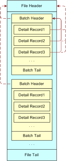 - (If supported) Batch header and tail records. If the payment consolidator supports batch processing, then the detail records in the input file will be grouped by batch record. Batch header is stored at the beginning of a batch and the tail record goes at the end of a batch and enclose detail records.