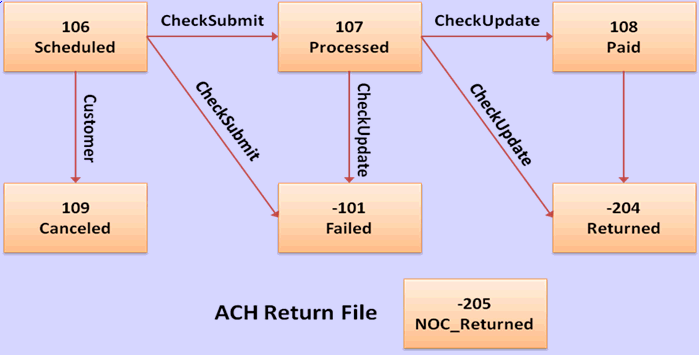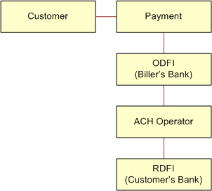 - The payment gateway (ODFI) processes the received check payment through the ACH operator to the RDFI. In this step, if there is an error clearing the check, then ACH creates a file containing a code that indicates why the check was returned, and sends the file to Oracle Billing Insight.