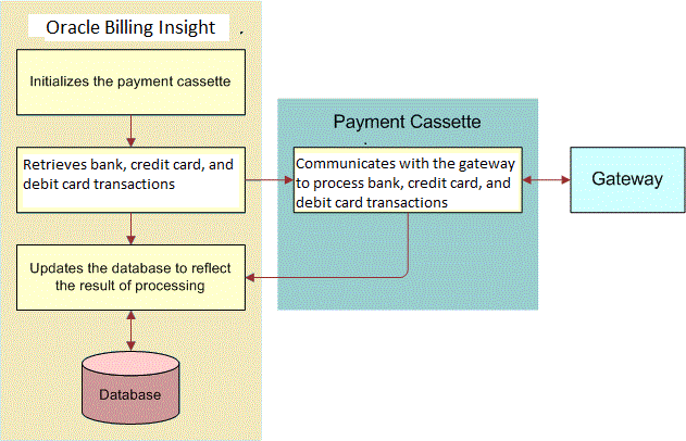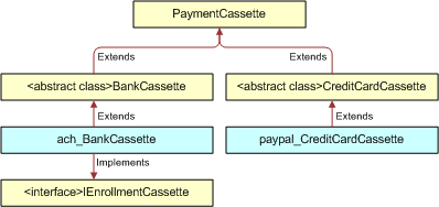 Implementation Guide for Oracle Billing Insight > Customizing Payment > About the APIs for Implementing Custom Payment Cassette CartridgesYou can implement custom payment cassette cartridges with Oracle Billing Insight. Oracle Billing Insight provides a set of well-defined interfaces for payment gateway integration, and it enables you to develop or customize the cassette according to your payment gateway requirements. You must set up the gateway to communicate with Oracle Billing Insight. You do not have to change anything internal to Oracle Billing Insight. Figure 20 shows an overview of the interaction between the payment cassette cartridge, Oracle Billing Insight, and the payment gateway. All APIs related to the payment cassette and cassette configuration are defined in the com.edocs.common.api.payment package. Figure 21 shows the contents of the com.edocs.common.api.payment package. Figure 22 shows the class structure of the Payment Cassette. Figure 23 shows the class structure of the Payment Cassette Config. Figure 24 shows the class structure of the Payment Cassette extended parameter. |