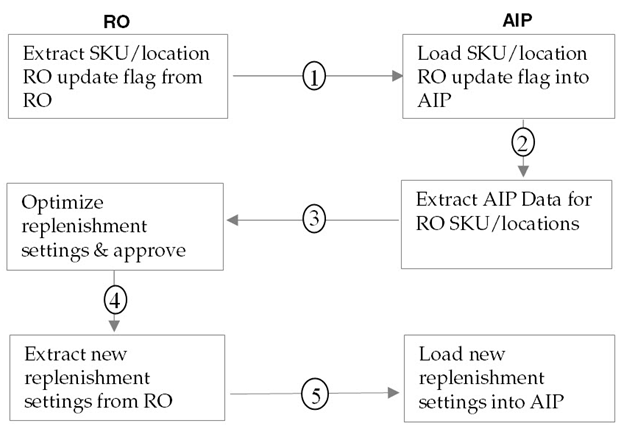 Replenishment Optimization (RO) suggests the most appropriate replenishment method and thresholds to use based on the business goals set in RO, and the supply-chain. The supply-chain information is provided to RO by AIP. The optimized settings should then be used in AIP when replenishment planning.