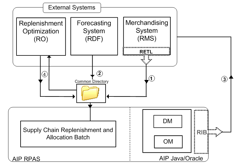 The store receipt plan and the warehouse receipt plan are exported out of the AIP RPAS platform for transfer by a client's job scheduling process to the Order Management module in the Java/Oracle platform. Also, RMS data required in DM on the Java/Oracle platform are also exported out of the RPAS platform for transfer to the Oracle database. |