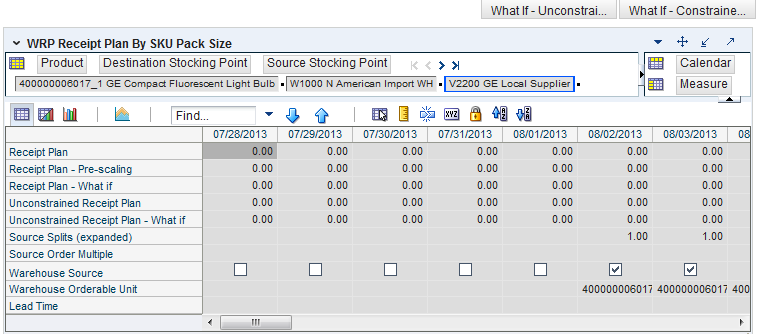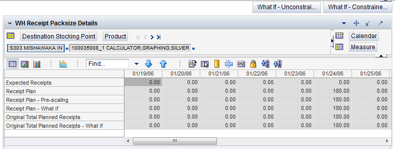 Read-only measure which contains the Constrained Receipt Plan, calculated in the most recent batch run, prior to applying Supplier and Container Scaling Constraints. This measure has a related filtered worksheet. See the WH Receipt Packsize Details View for more information. |