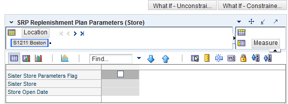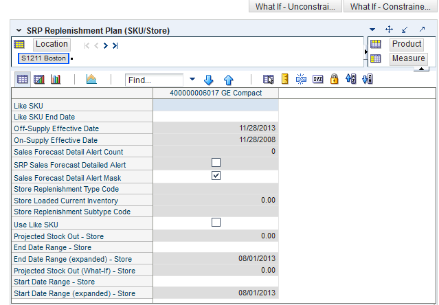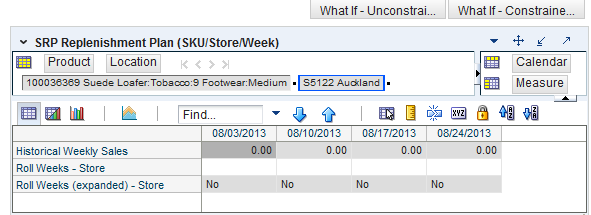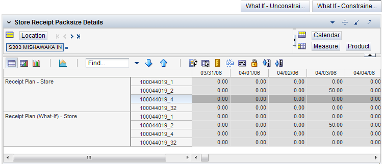 The Store Receipt Plan - What-if initially displays the Receipt Plan calculated in the previous AIP Batch run. If any changes are made to SRP parameters and you select What-if - Unconstrained or What-if - Constrained from the What-if button on the menu bar, this measure is updated with the newly calculated Receipt Plan for the SKU/Store. This measure has a related filtered worksheet. See the Store Receipt Packsize Details View for more information. |