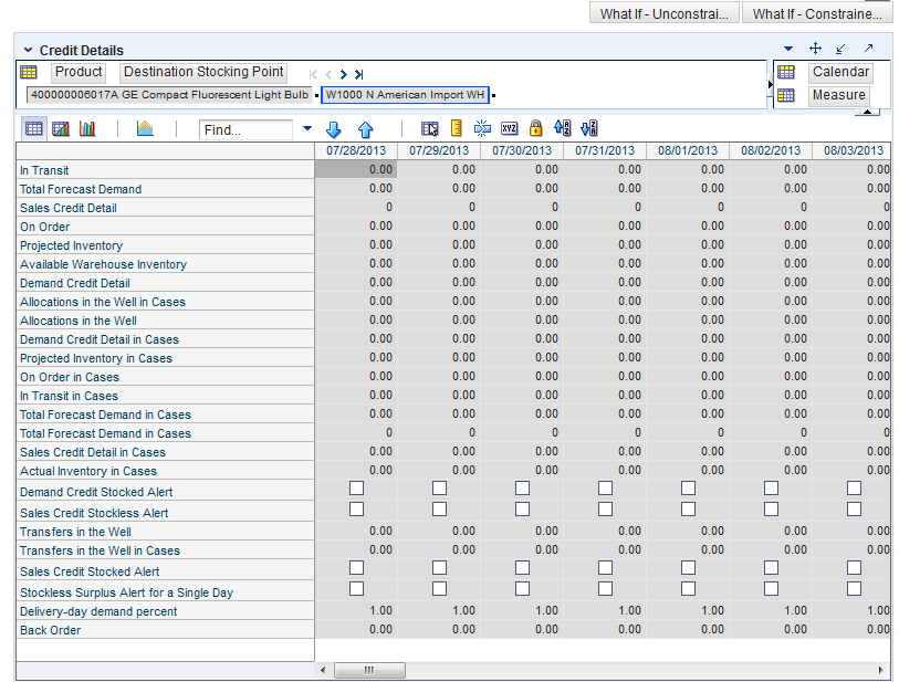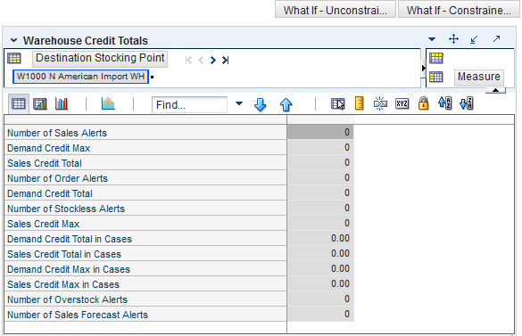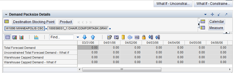 Warehouse Capped Demand - What-if is the resulting value after What-if calculations have been performed on the Warehouse Capped Demand measure. This measure has a related filtered worksheet. See Demand Packsize Details View for more information. |