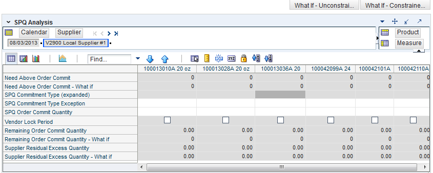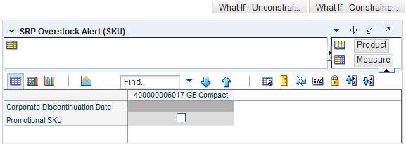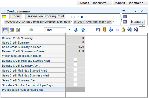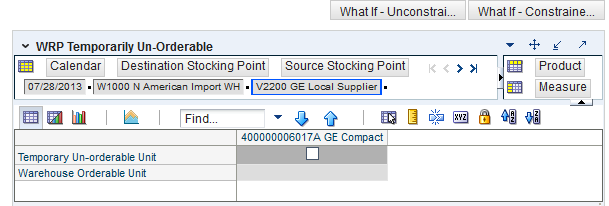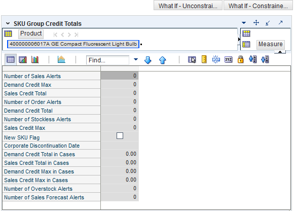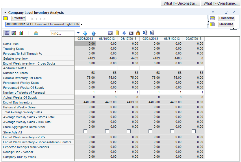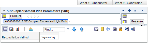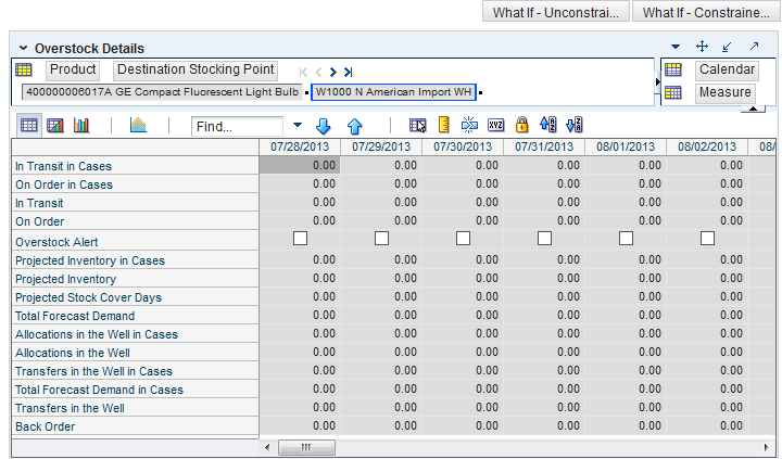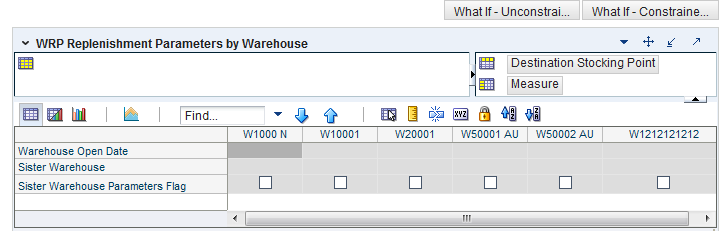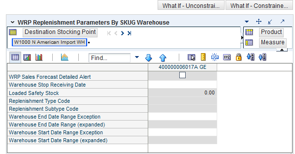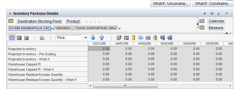 Warehouse Capped PI - What-if is a read-only measure that represents the projected inventory using the demand adjusted by SKU caps at the store. If any changes are made to WRP parameters and you select What-if - Unconstrained or What-if - Constrained from the What-if option on the menu bar, this measure is updated with the newly calculated Capped PI for the SKU/Warehouse. This measure has a related filtered worksheet. See Inventory Packsize Details View for more information. |