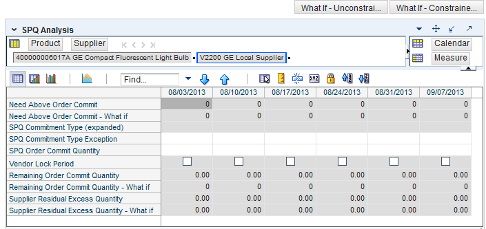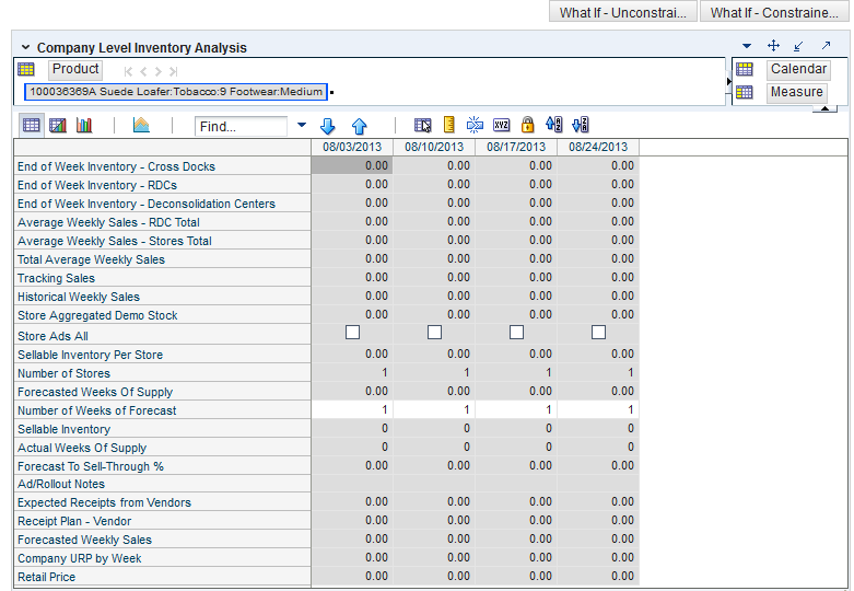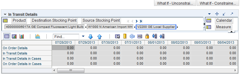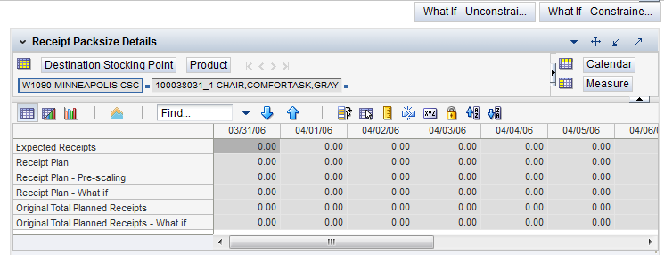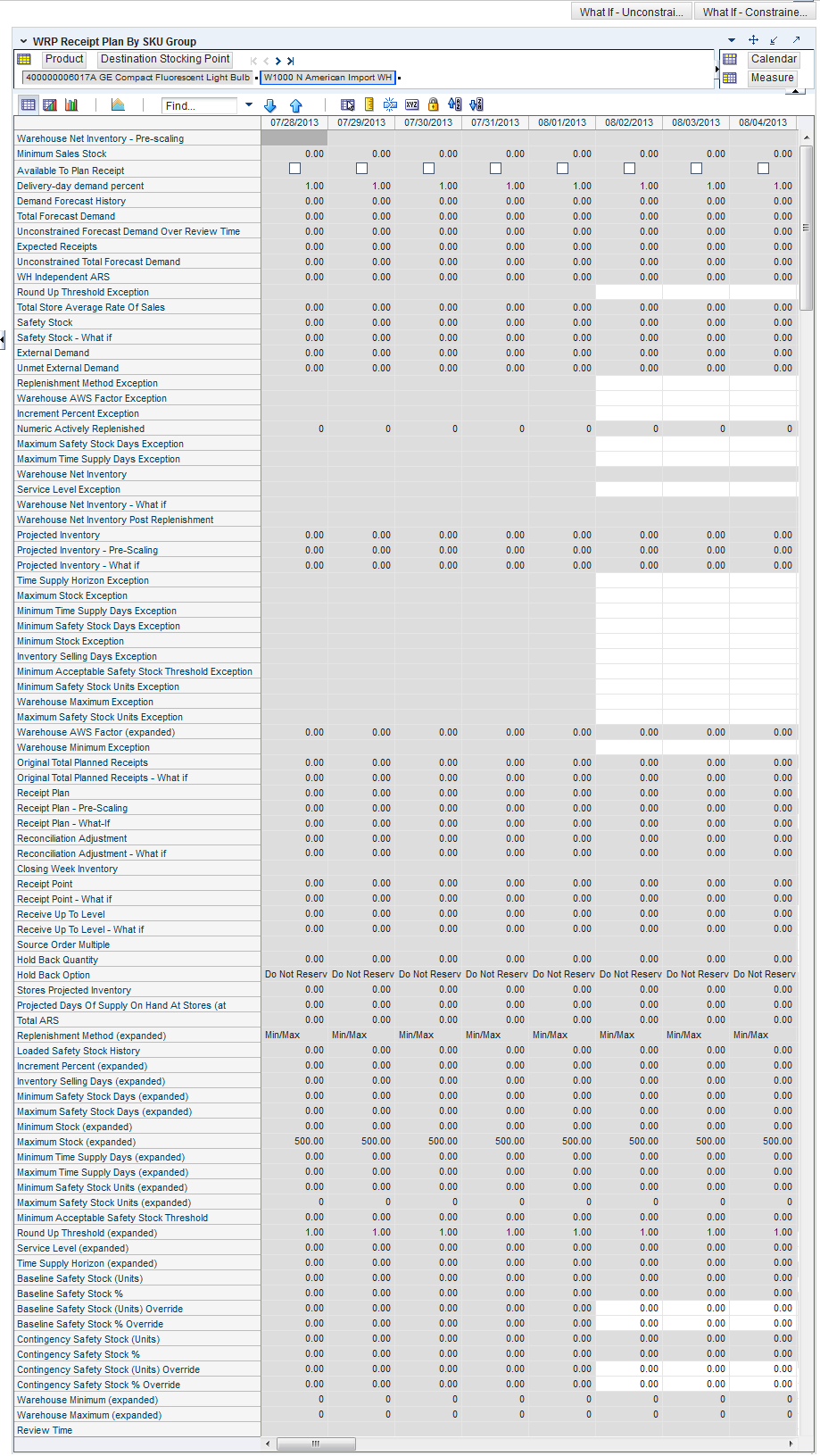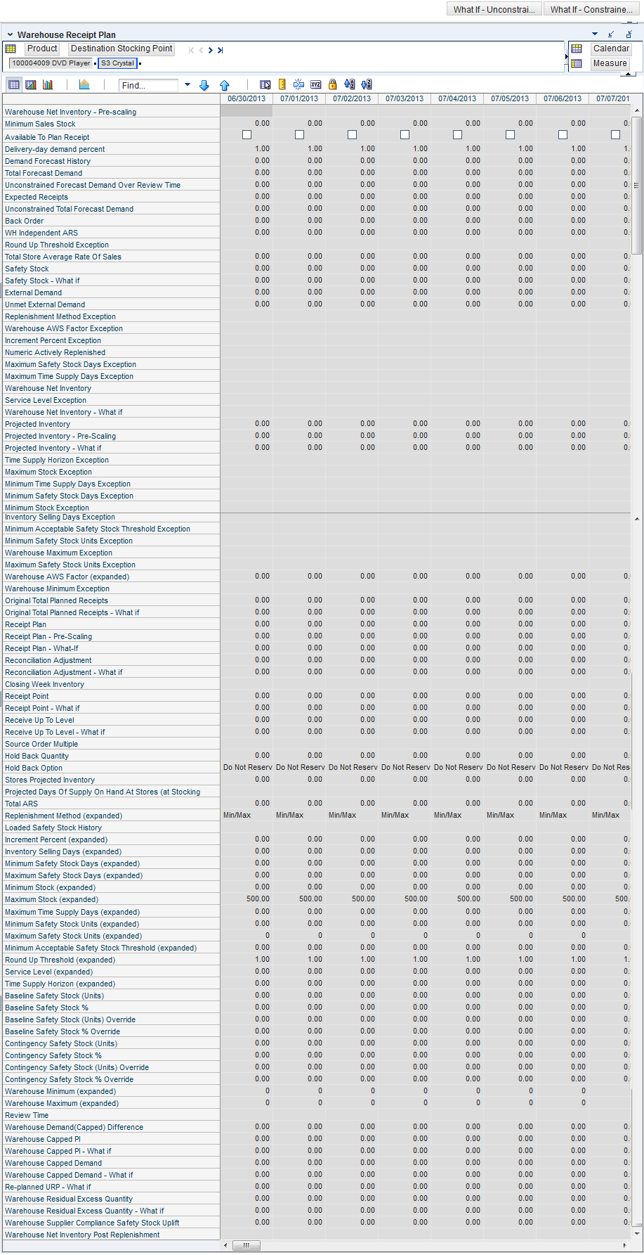 This Receipt Plan – What-if measure initially displays the Pre-scaling Constrained Receipt Plan calculated in the most recent AIP Batch run. If any changes are made to WRP parameters and you select What-if – Unconstrained or What-if – Constrained from the What-if option on the menu bar, this measure is updated with the newly calculated CRP for the SKU/Warehouse. |