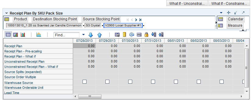 The Receipt Plan represents the Final Constrained Receipt Plan calculated in the most recent batch run. The receipts include any impacts due to scaling to Supplier Minimums and Container Minimums. |