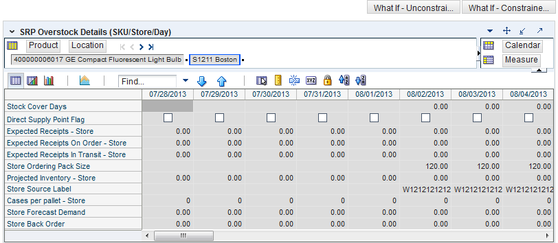 This view displays detailed overstock information at the SKU/Store/Day level.