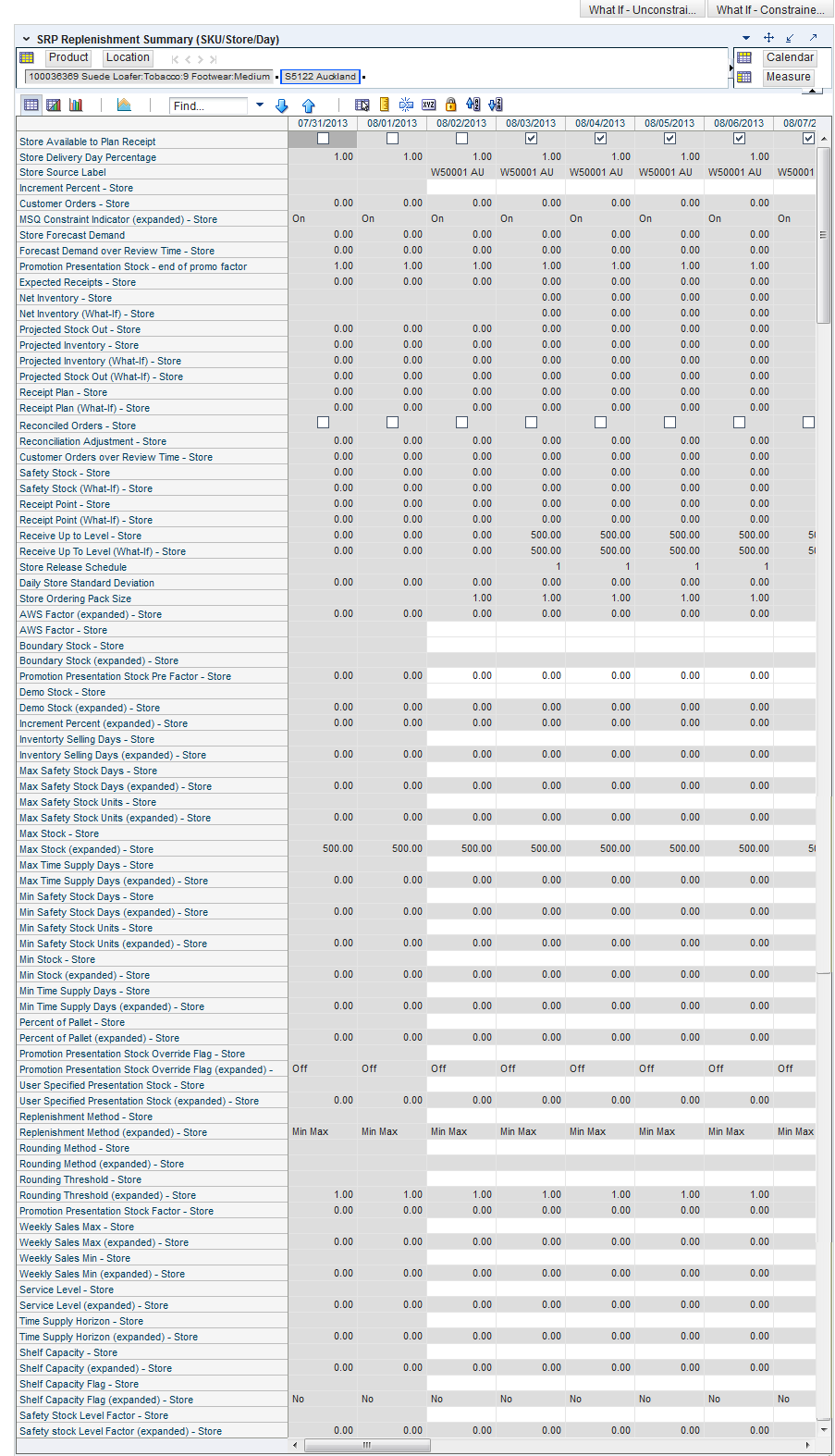 The Receipt Plan - Store represents SRP's recommendations for ordering based on demand, allocation boundaries and available inventory. The Receipt Plan is final result calculations in AIP Batch including adjustments made to Ideal Receipt Quantity based on rounding and constraints made to the Unconstrained Receipt Plan based on inventory available at the source. This measure has a related filtered worksheet. See the Store Receipt Packsize Details View for more information. |