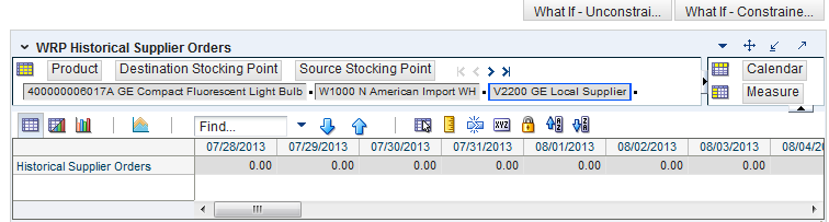 This Original Total Planned Receipts – What-if measure initially displays the un-reconciled total planned receipts calculated in the most recent AIP Batch run. If any changes are made to WRP parameters and you select What-if – Unconstrained or What-if – Constrained from the What-if option on the menu bar, this measure is updated with the newly calculated URP for the SKU/Warehouse. |