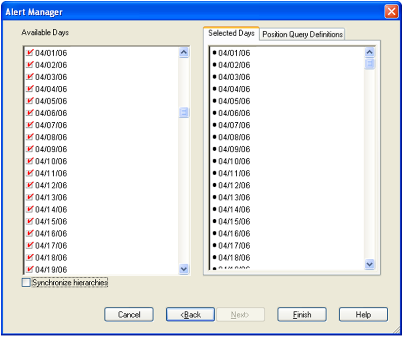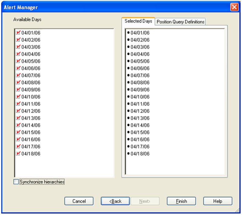 Select the stores that you want to view to in the workbook, and click Next. The Alert Manager - Available Days Window opens.